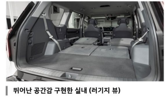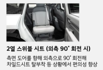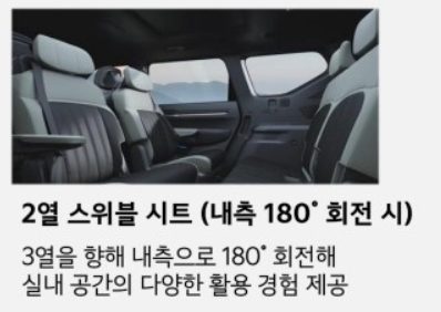 - 특히 2열의 경우 벤치 시트, 기본형, 릴랙션형, 스위블형 등 4가지 시트를 적용할 수 있는데 스위블형은 180도 회전이 가능한 시트로 다양한 차량 이용자들의 니즈를 만족시킬 수 있을 것으로 예상. 스위블 시트에서 180도 회전을 하면 3열과 마주볼 수 있음. 3열을 접고 2열을 스위블로 한 다음 테일게이트(트렁크문)을 열어 배경을 감상하거나 휴식을 취할 수 있으며 90도 회전도 가능