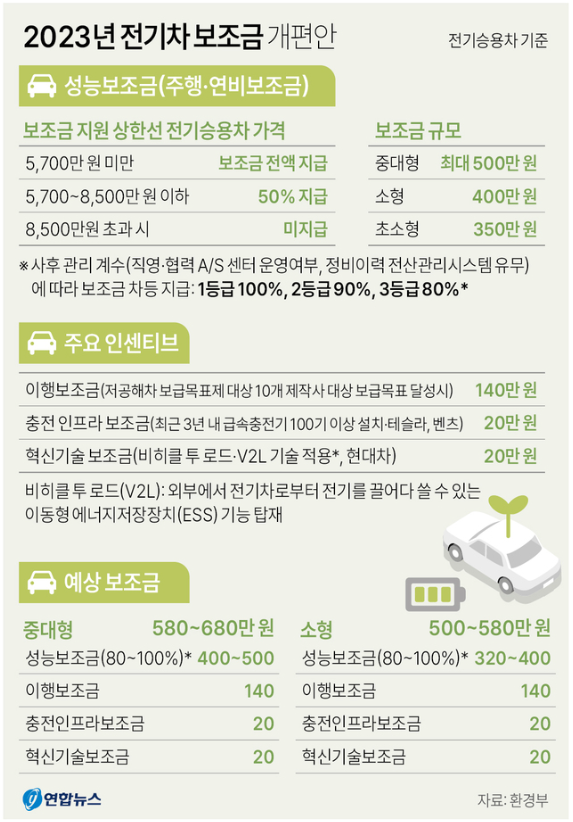 가격은 6,500만원 후반대에서 출발하나 옵션 등 고려하여 8,000만대가 될 것으로 예상됩니다. 2023년 기준 전기차 보조금은 차량가격 최대 8,500만원 이하일 경우 50%지원받을 수 있도록 책정됩니다. 아래를 보시면 좀 더 자세히 알 수 있는데요, 보조금은 최대 500만원이지만 주요 인센티브에 책정된 140만원+20만원+20만원을 하게 될 경우 최대 680만원의 국고보조금을 지원받을 수 있습니다.