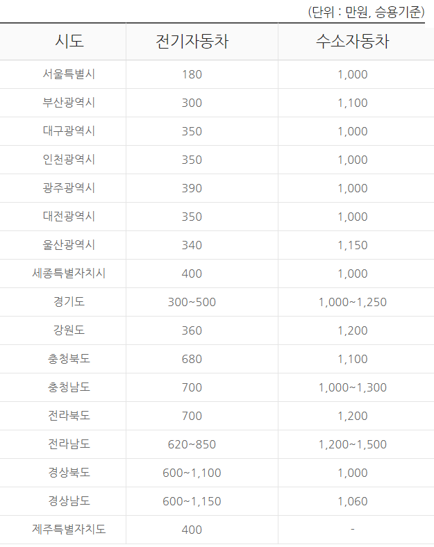 여기에 플러스! 지자체 보조금이 더해지는데요, 아래 표에서 지자체별 보조금 지원현황을 확인하세요. 서울은 180만원이고 가장 높은 지역은 경상남도로 1,150만원입니다. 결국 680만원+1,150만원=1,830만원 보조금 책정이 가능합니다. 여기에 차량 가격에 따른 비율을 적용하시면 되겠습니다.